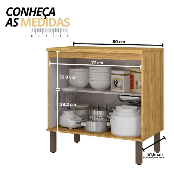 - Amplo Espaço Interno: Com 80cm de largura e uma prateleira, organiza panelas, potes e mantimentos, deixando tudo ao seu alcance.