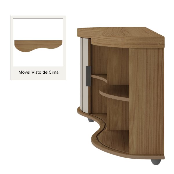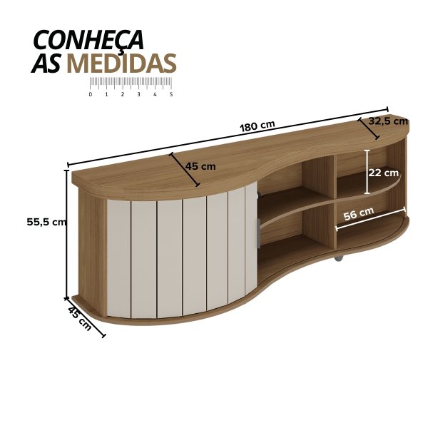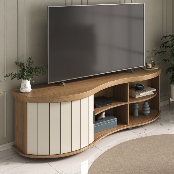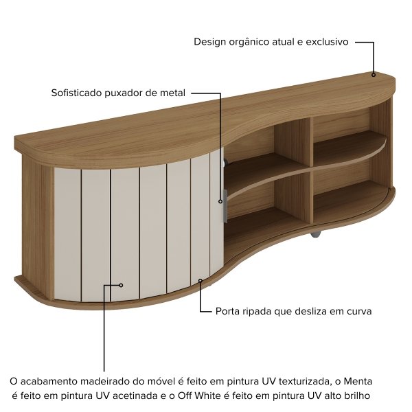 - Diferenciais: Porta reversível (duas opções de cores), design orgânico exclusivo, tampo curvo robusto, porta ripada curva, puxador de metal, estrutura robusta e materiais de qualidade, suporta grande variedade de TV's, duas opções de cores coringas e elegantes.