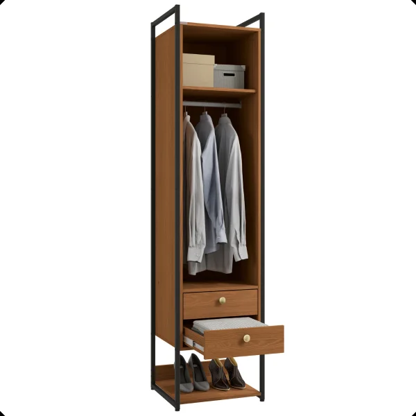 O Armário Roupeiro Slim Crome Canela e Preto Fosco é a pura essência do estilo "Loft". Com apenas 48,5 cm de largura, ele funciona como um baluarte de organização. O contraste poderoso do metal Preto Fosco com a porta e gavetas em tom Canela cria um ponto focal de forte personalidade. Atrás da porta, um cabideiro metálico e prateleiras; abaixo, duas gavetas robustas com corrediças telescópicas. É a peça-chave para quem valoriza organização discreta e estilo urbano.