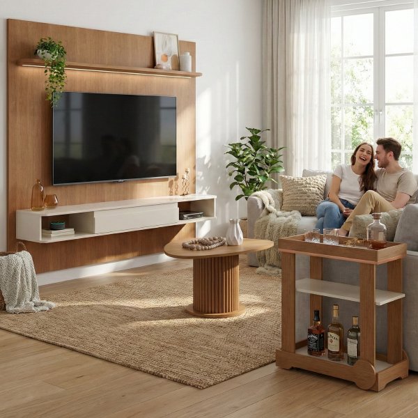 A Dkadi Decor reuniu o Conjunto Belluno para mudar isso: imagine a fluidez do design orgânico unindo o seu sofá ao cinema em casa, com o LED do painel emoldurando a sua TV de 75" enquanto você serve um drink no Carrinho Rosé. É a transição definitiva para um living de alto padrão.