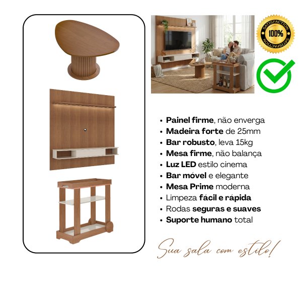 Sala Belluno: Painel TV 75" com LED, Mesa Centro e Carrinho Bar Cinamomo