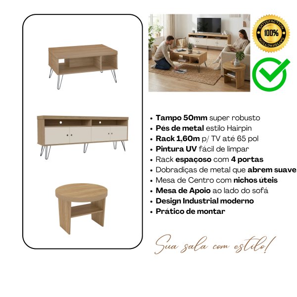 - Suporte Dedicado a Pequenos Objetos: Como o foco é manter o design elegante, as mesas de centro e lateral possuem um limite de carga focado no dia a dia (8kg e 3kg). São perfeitas para controles e livros, mas exigem que você evite usá-las como assento.