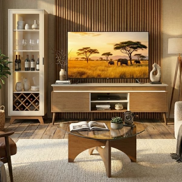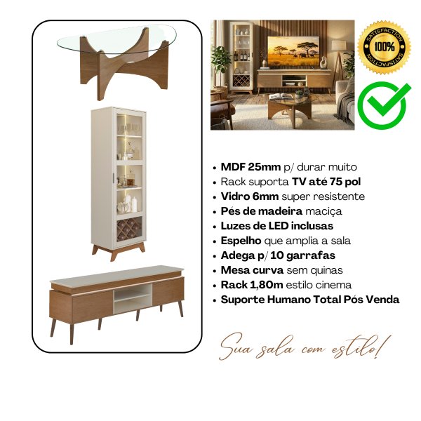 P.S.: Este conjunto une o suporte firme de 75 polegadas do rack com a elegância do bar iluminado. Garantia de 90 dias contra defeitos de fabricação em todas as peças. O lote atual no acabamento Cinamomo com Off-White costuma esgotar rapidamente nesta época do ano.