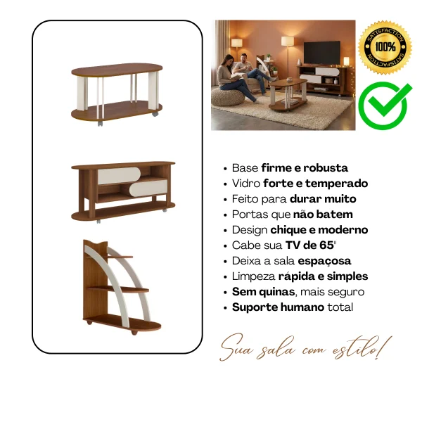 - Circulação Inteligente: Com 91cm de largura e design curvo, a mesa de centro elimina o efeito barreira, suavizando a passagem e evitando batidas acidentais.