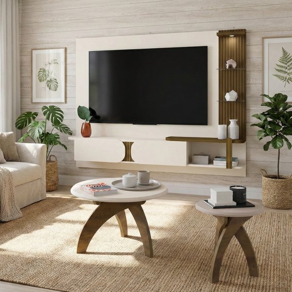 Sala de Estar Painel Toronto 200cm e Mesas Jade Off White e Pinho - Suporta 46kg e TVs de 72 Polegadas